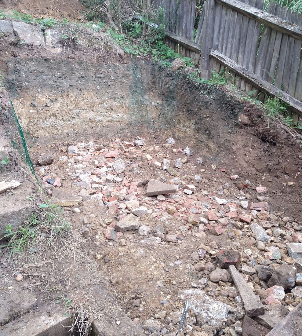 It's not a great photo, but the back of the pit is around four feet high. This was part of an embankment at the bottom of our garden, so it was sloped, but that's still a lot of earth to move.